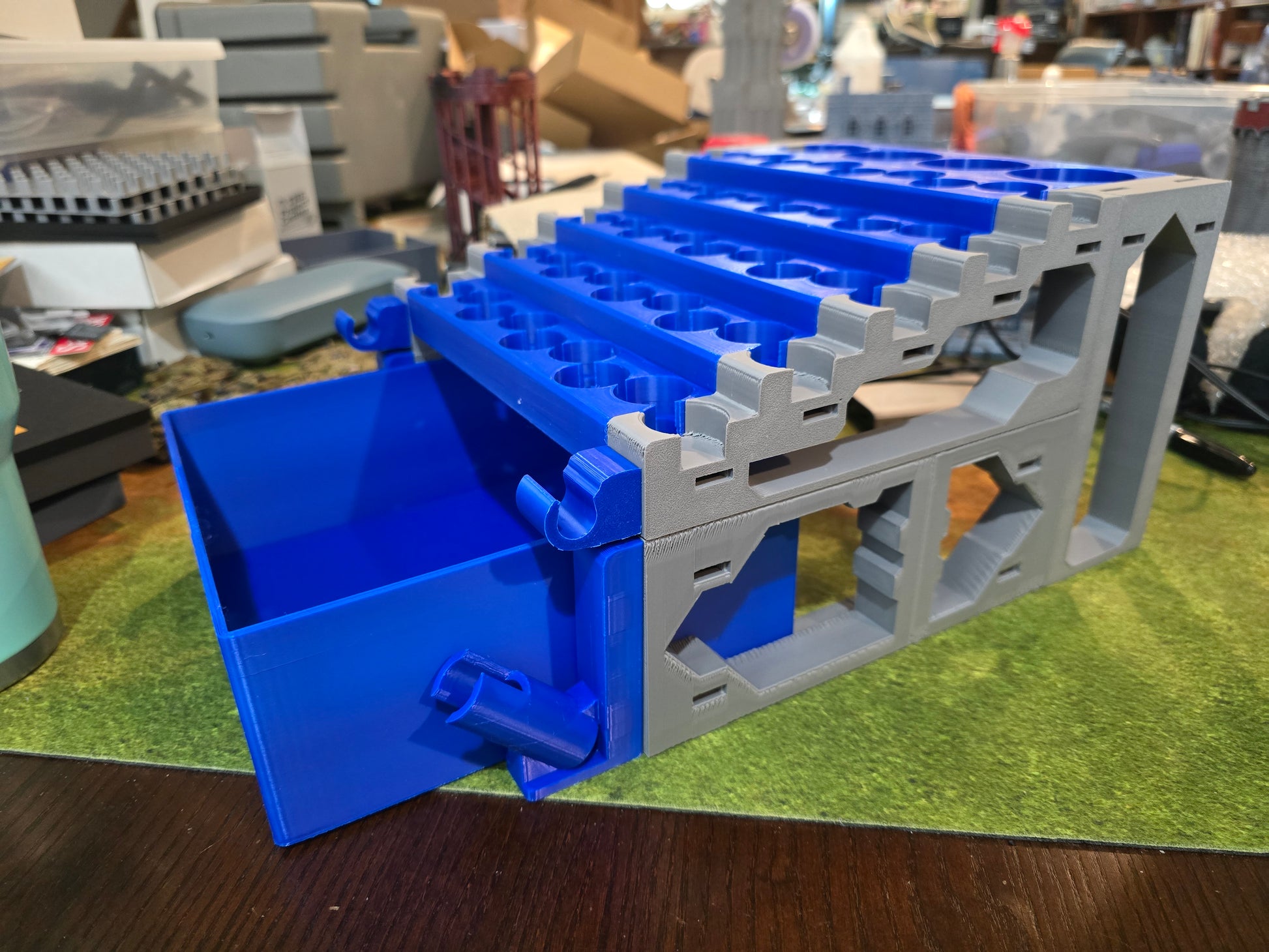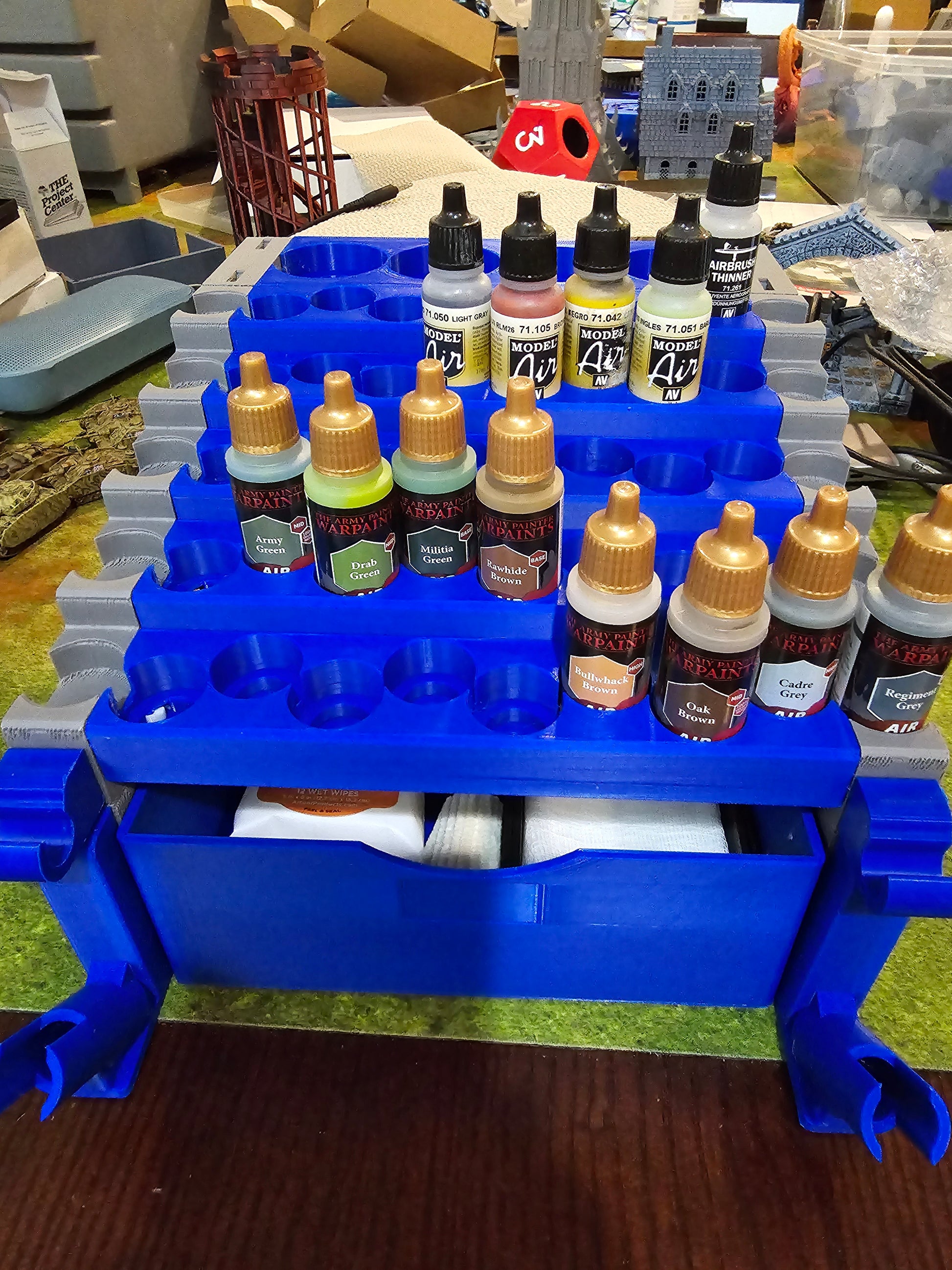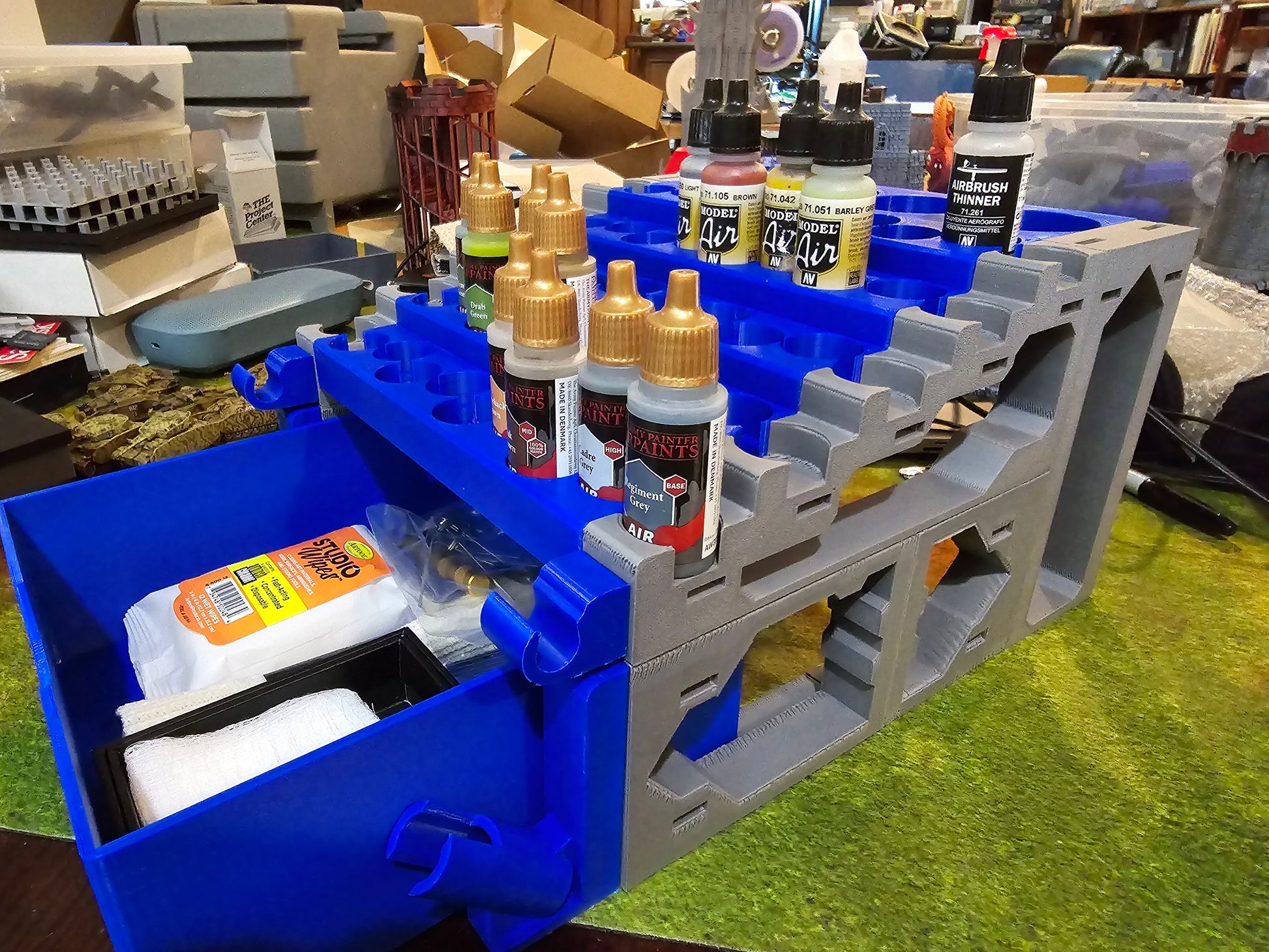 This large Airbrush Station has the capacity to hold 50 17ml paint bottles (Vallejo, Army Painter, etc) and four 200ml size bottles. Also has a large drawer underneath to store other items like cleaning tools and supplies and has two brush holder attachments.