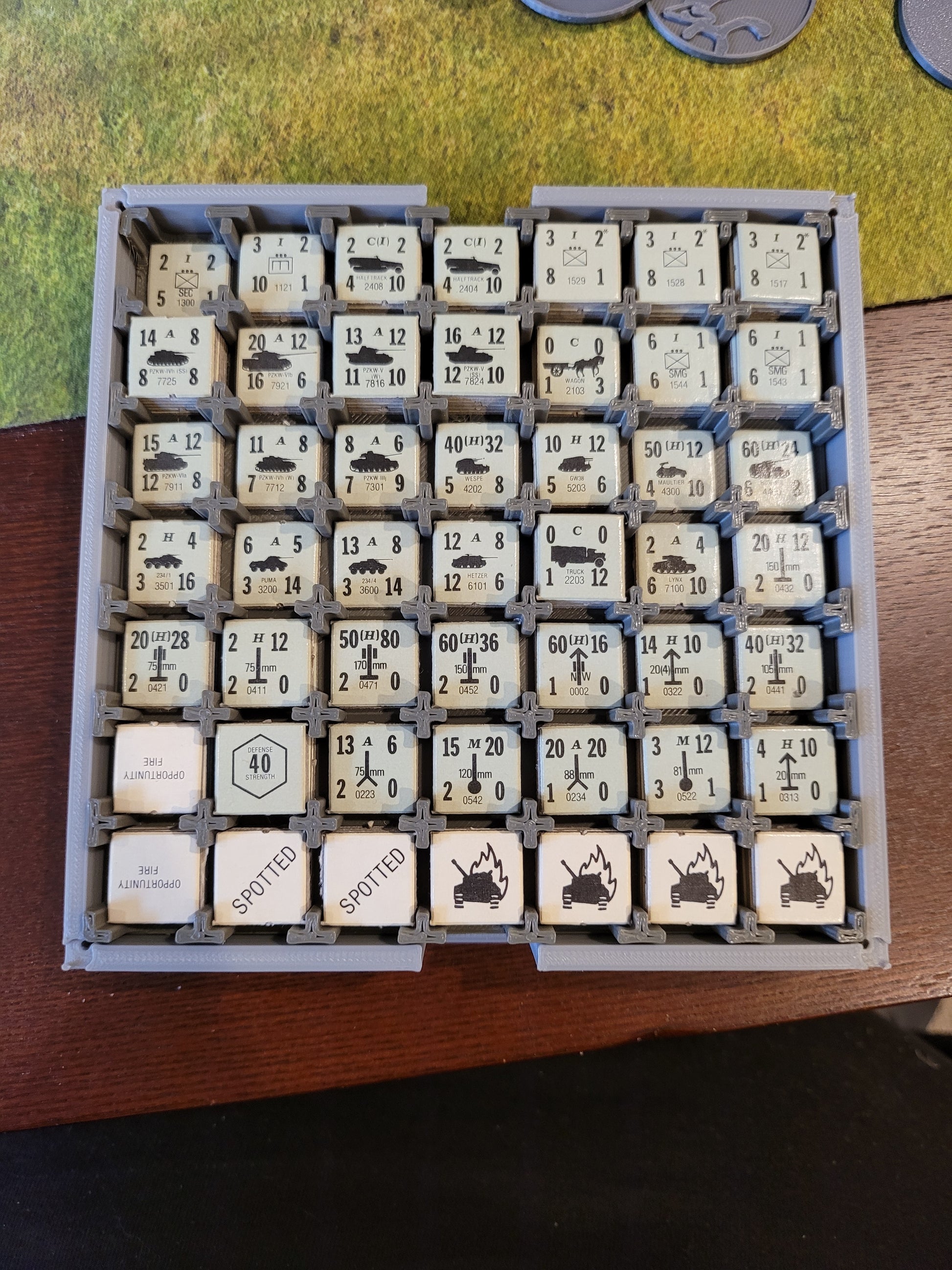 This storage system is perfect for any board game that uses 1/2", 5/8"  or 11/16" counters, or a combination of both and is 100% compatible with Advanced Squad Leader. The system comes in three different sizes, a 2 tray, 3 tray and a 4 tray. The 5/8" trays also work with most GMT games and the 11/16" trays work with Avalanche Press. The storage system consists of the storage box, the counter / token trays and a magnetized lid. We currently offer four types of counter storage trays. The counter storage tray are a 1/2" counter tray that will hold 384 counters, a 5/8" counter tray that will hold 294 counters, a 11/16" tray that will hold 294 counters and a combined tray that will hold 228 counters and has space for other accessories such as tweezers, small dice , LOS string, etc. The counter count is assuming a counter thickness of 1.5mm. If you have thicker counters the the trays will hold proportionally less. Most all Avalon Hill, GMT, etc have standard 1.5mm thick counters. Yaquinto are 2mm, older Avalanche Press are 1.25mm and newer Avalanche Press are 2.4mm. Each compartment can hold a 9mm height stack. A free set of 3D printed tweezers are included with every order. These storage boxes are 3D printed in a random color (mostly shades of grey or black). If you would like a specific color please note in the order and I will try to accommodate. Please note this could take up to a week longer to fulfill.