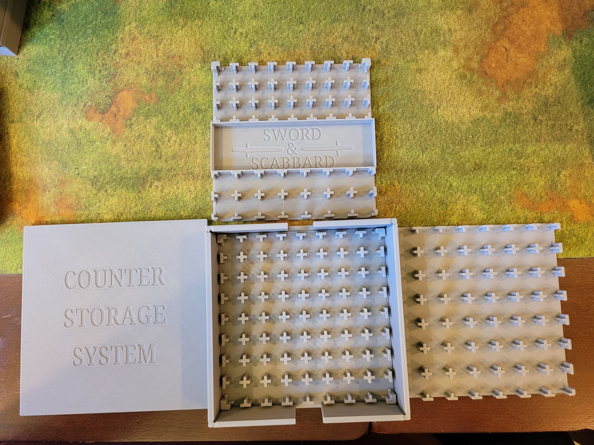 This storage system is perfect for any board game that uses 1/2", 5/8"  or 11/16" counters, or a combination of both and is 100% compatible with Advanced Squad Leader. The system comes in three different sizes, a 2 tray, 3 tray and a 4 tray. The 5/8" trays also work with most GMT games and the 11/16" trays work with Avalanche Press. The storage system consists of the storage box, the counter / token trays and a magnetized lid. We currently offer four types of counter storage trays. The counter storage tray are a 1/2" counter tray that will hold 384 counters, a 5/8" counter tray that will hold 294 counters, a 11/16" tray that will hold 294 counters and a combined tray that will hold 228 counters and has space for other accessories such as tweezers, small dice , LOS string, etc. The counter count is assuming a counter thickness of 1.5mm. If you have thicker counters the the trays will hold proportionally less. Most all Avalon Hill, GMT, etc have standard 1.5mm thick counters. Yaquinto are 2mm, older Avalanche Press are 1.25mm and newer Avalanche Press are 2.4mm. Each compartment can hold a 9mm height stack. A free set of 3D printed tweezers are included with every order. These storage boxes are 3D printed in a random color (mostly shades of grey or black). If you would like a specific color please note in the order and I will try to accommodate. Please note this could take up to a week longer to fulfill.